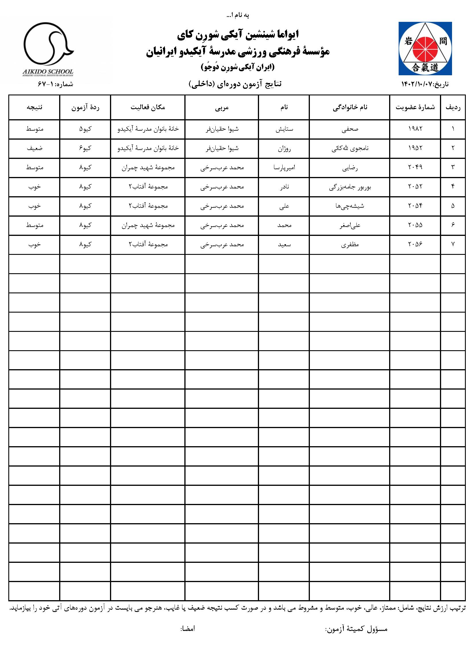 نتایج آزمون داخلی پاییزهٔ ۱۴۰۲